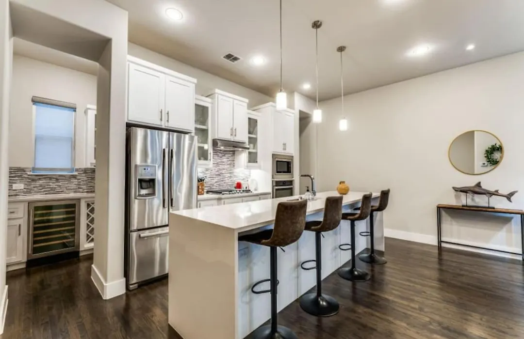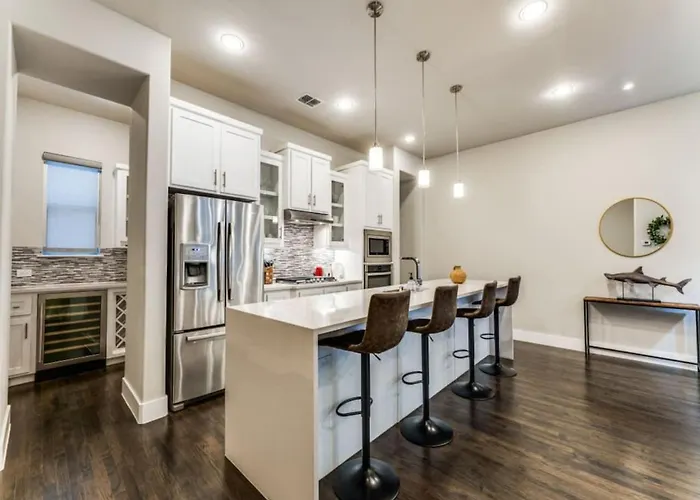 Há cozinha totalmente equipada com comodidades auto-suficientes, incluindo forno e máquina de lavar loiça para uso dos hóspedes. Servindo pratos da cozinha Amerikaanse, Ross & Hall Kitchen + Beer Garten está situado a apenas 6 minutos a pé de distância. São necessários 15 minutos de carro da pousada Cozy 3Br Luxury Townhome Near Uptown Skyline Wfh Friendly para chegar ao aeroporto em Dallas Love Field.